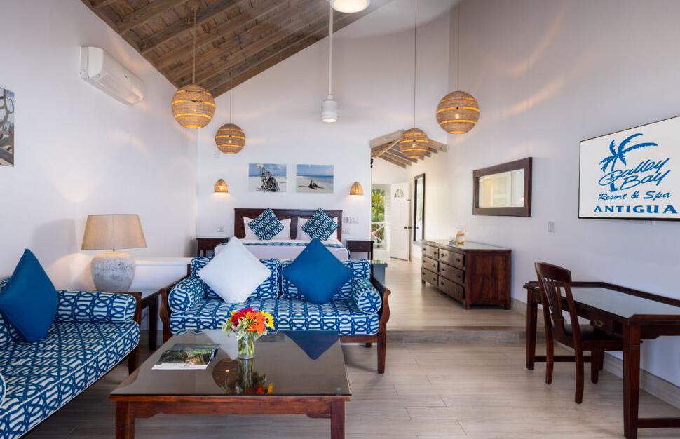 Premium Beachfront Suites are in 2-storey buildings, these have a bedroom and sunken living room with wet bar, huge bathroom with twin sinks, large bath and double walk-in shower, plus ocean views from the balcony or terrace, making these the largest and most luxurious option with iPod docking station, slippers and WiFi access. With 1 king-size bed, sleeping maximum 3 adults. A full-size rollaway bed is provided for Premium Beachfront Suites to allow for triple occupancy. These rooms have direct beach access on the ground floor only.