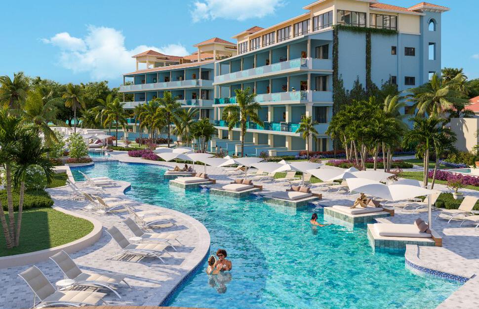 Travertine Beachfront Club Level Room with Balcony Tranquility Soaking Tub rooms are located in the Travertine building. These oceanfront rooms overlook the white sand beach, with spectacular view from the balcony, which also features a private Tranquility Soaking Tub™ for two and a charming bistro dining set. The modern and spacious interior features a king-size bed, stocked bar, HD Smart TV, and a plush sofa chair. The bathroom has a spacious walk-in shower, dual sink with vanity and a make-up table.