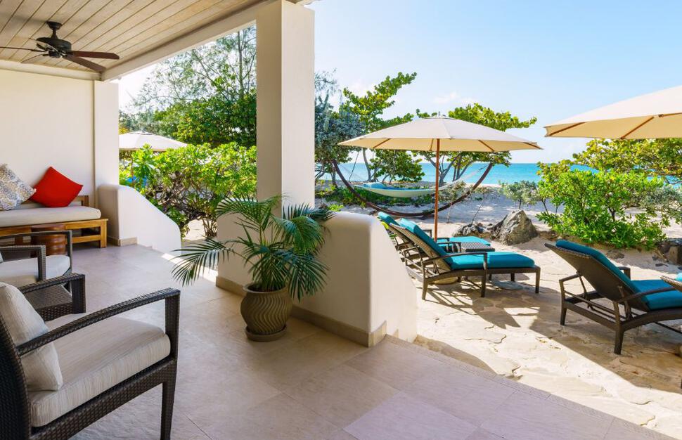 Sea Grape Beach Suites are on the beach with superb ocean views. They have a living area and their own private 225 sq ft of garden terrace on the beach with loungers and a hammock. With 1 king-size bed or 2 queen-size beds and a full-size sleeper sofa, sleeping maximum 3 adults and 1 child or 2 adults and 2 children.