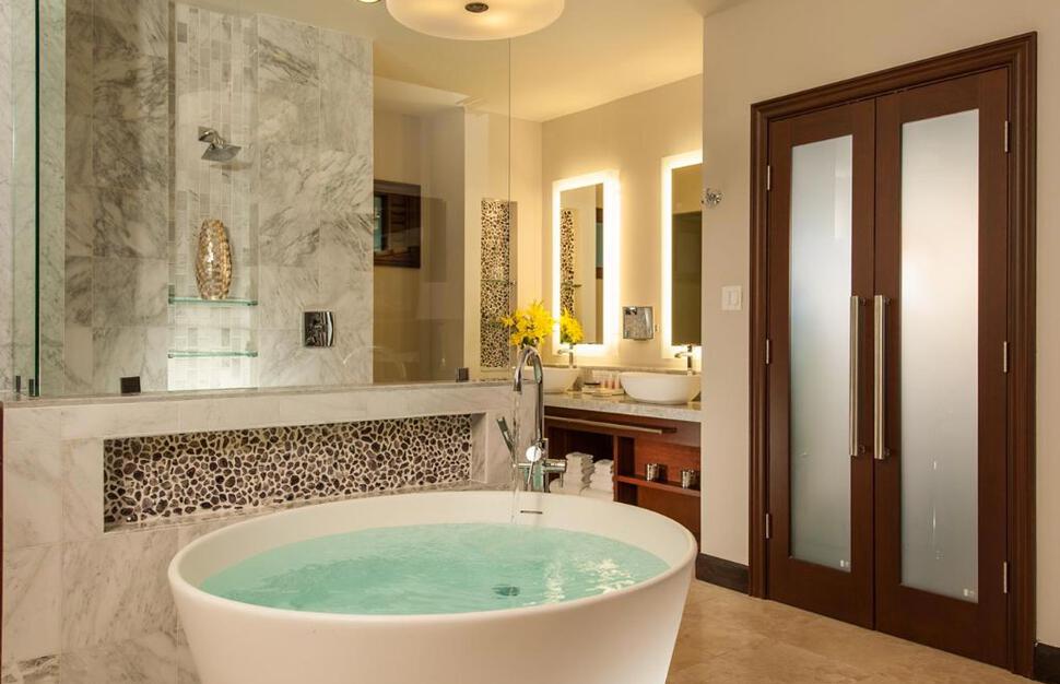 Romeo & Juliet Butler Suites with Balcony Tranquility Soaking Tub are located on the ground floor, these honeymoon suites feature a spacious bedroom with a dining area and an expansive private patio including an outdoor Tranquility Soaking Tub for two. The bedroom features handcrafted mahogany furniture, a 4-poster, king-size bed and HD smart TV. The en-suite bathroom includes a walk-in shower, his and hers vanity and a water closet enclosed with frosted glass.